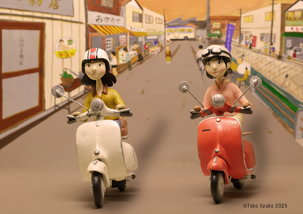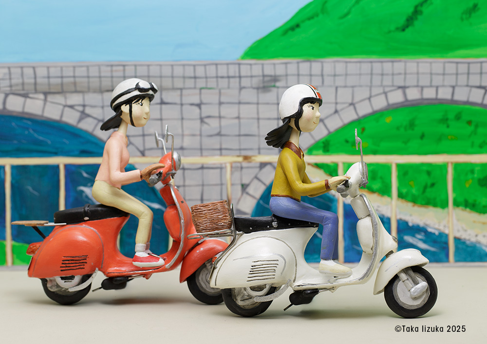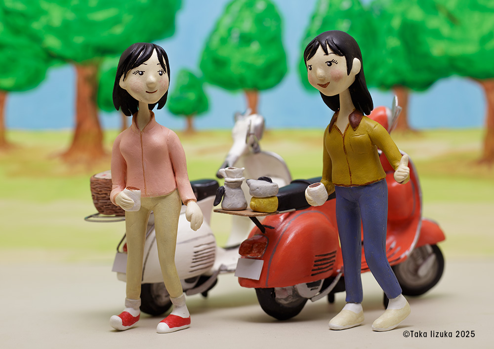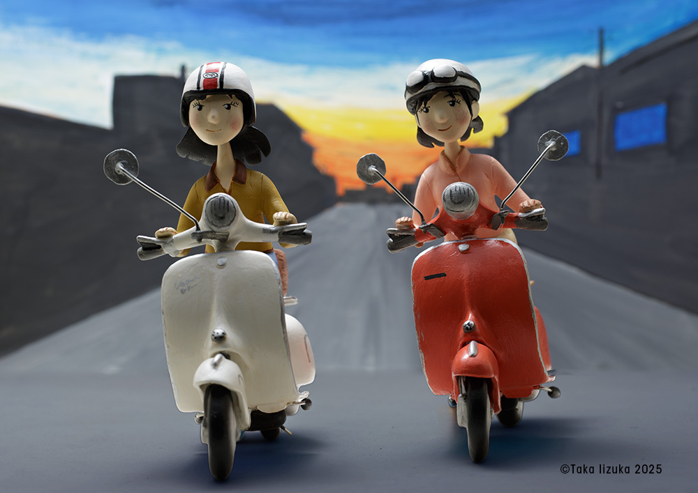 二人の女の子は夜明け前、美味しいコーヒーを飲むためにラージベスパで出発した。 |