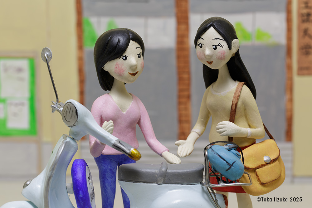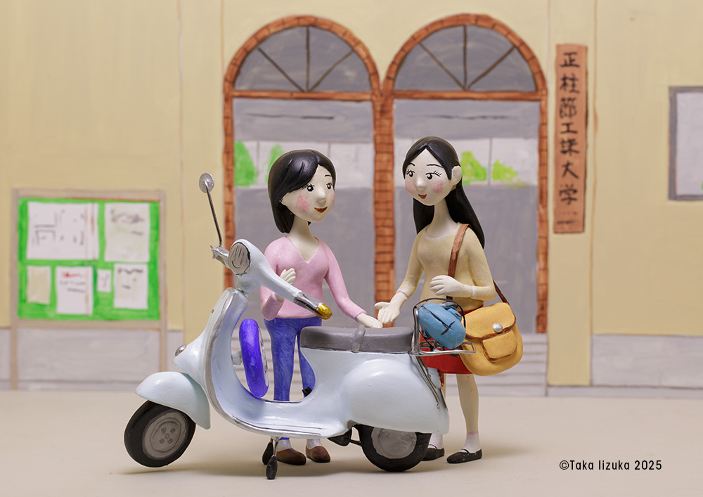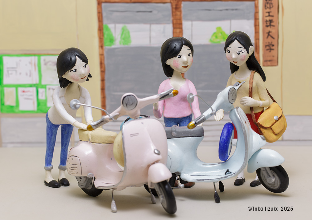 Vespa 50sがまだ生産されていた時、大学生の彼女は、飲食店でアルバイトをしVespa 50sを手に入れた。 キャンパス付近では、女学生を迎えにくるベンツ190E、ソアラ、クレスタなど、当時ハイソカーと呼ばれる車がうろうろしていた。