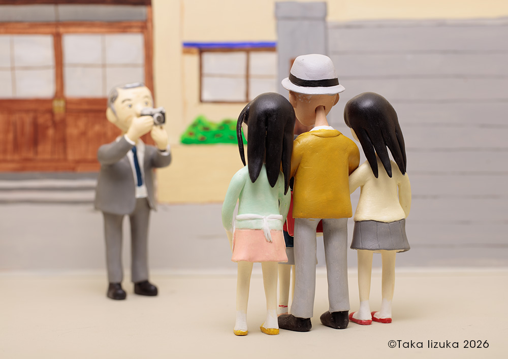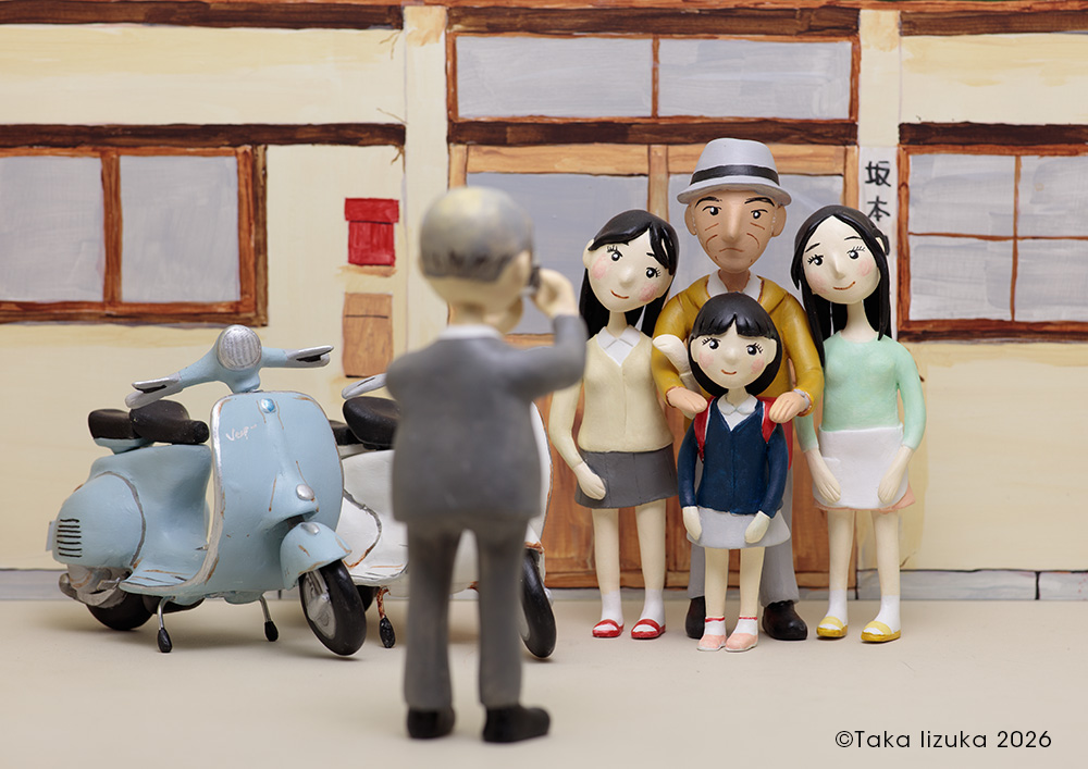 シオが小学校の入学式に向かう朝、アキは写真機を持ち出し、三人娘を玄関前で撮影しようとしていたところ、 通り掛かりの男に「お父さん、シャッター押そうか」と、声をかけられる。四人で写真に収まることに。